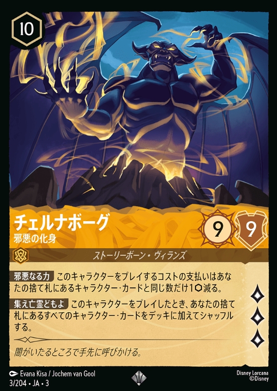 ①あなたの場のキャラクターの数に等しい数、このキャラクターをプレイするためのコストは1インク減る。②このキャラクターをプレイしたとき、あなたは「他のあなたの場のキャラクターの数に等しい数のカードを引く。その後引いた枚数に等しい枚数のカードを選び、捨てる。」をしてもよい。