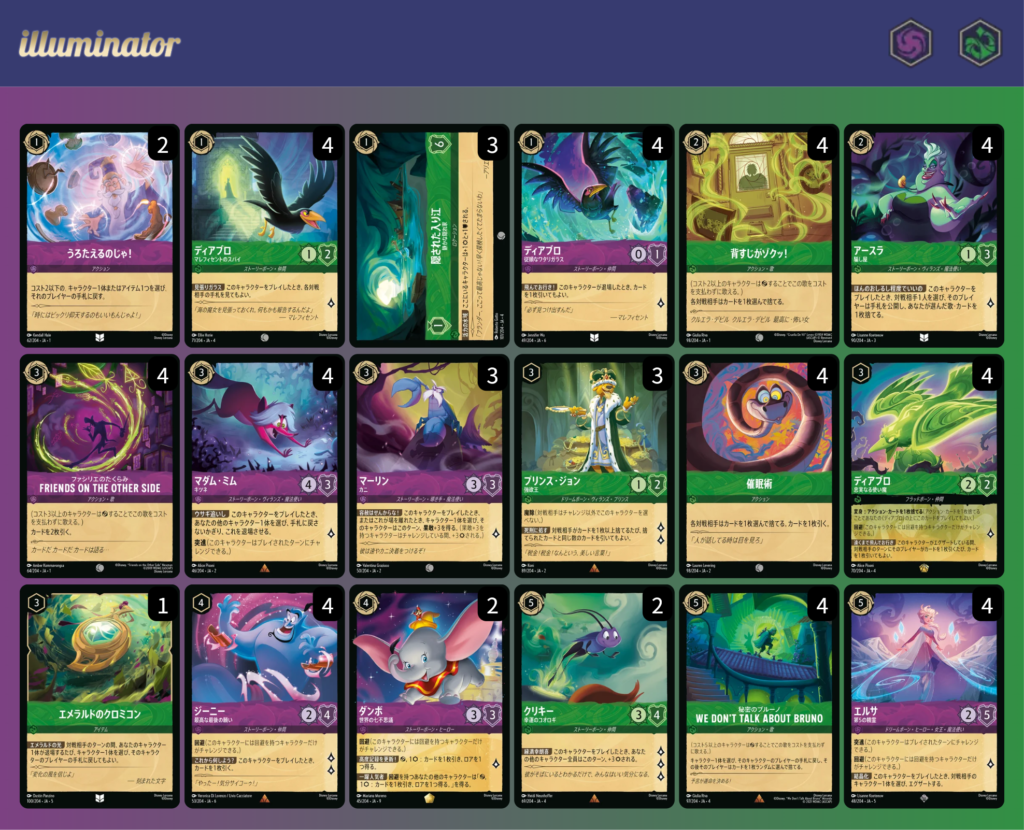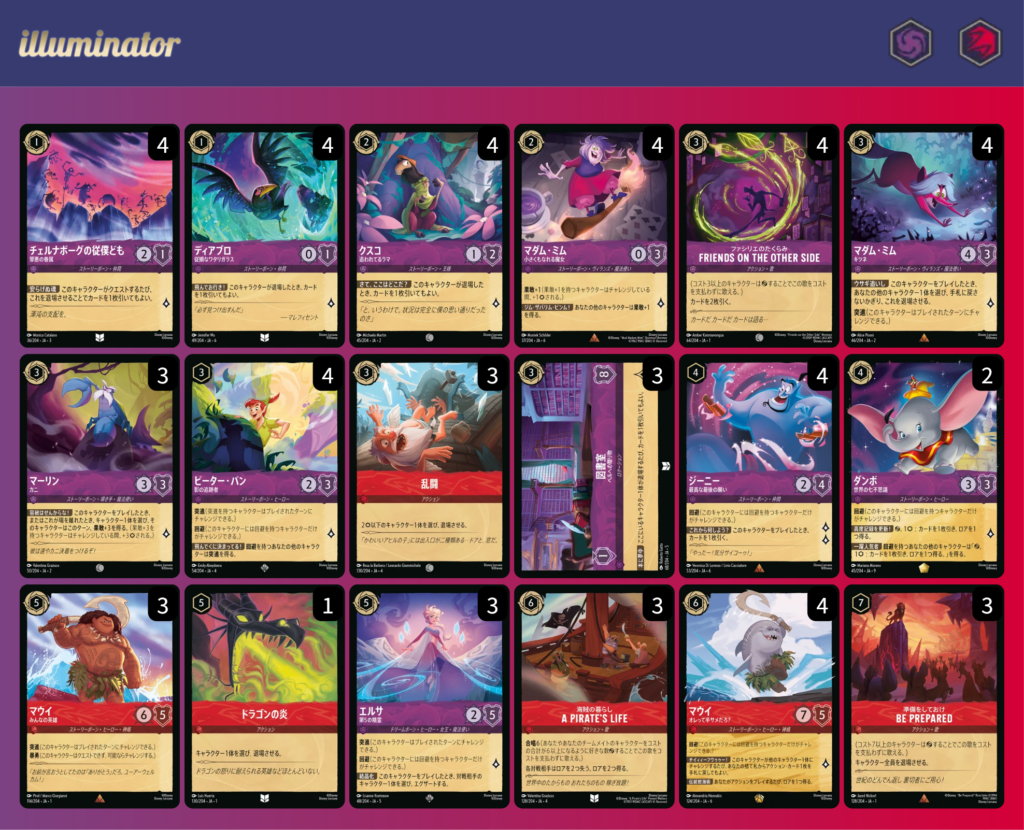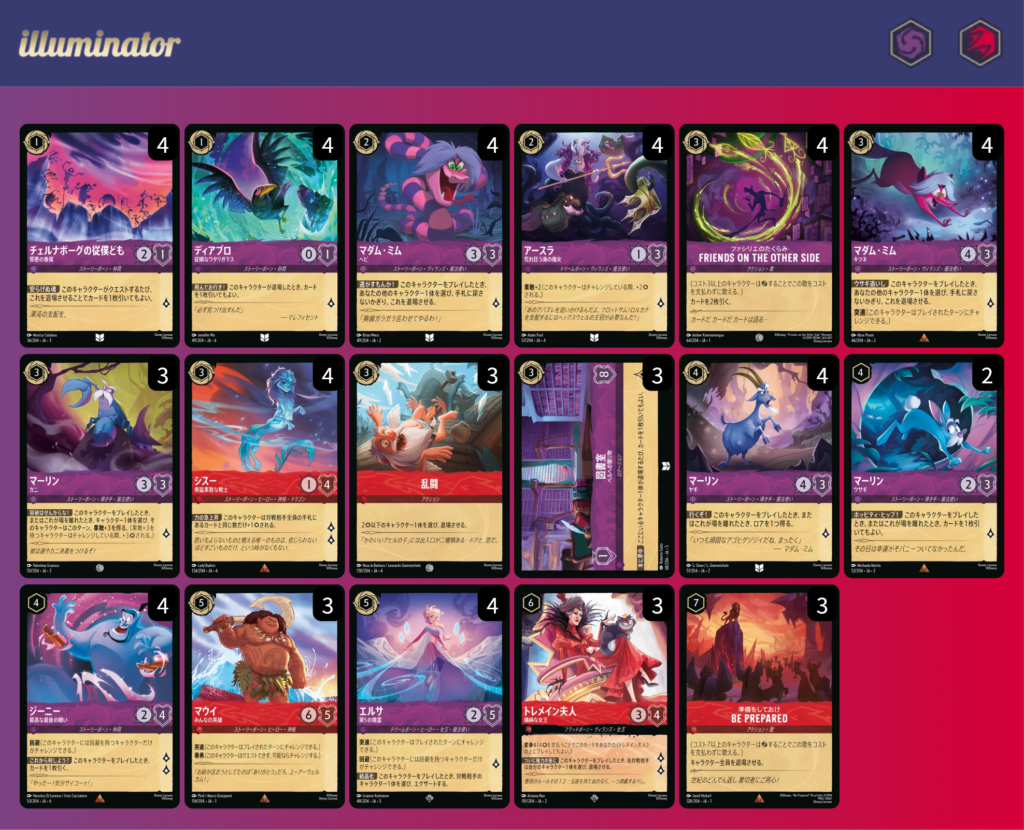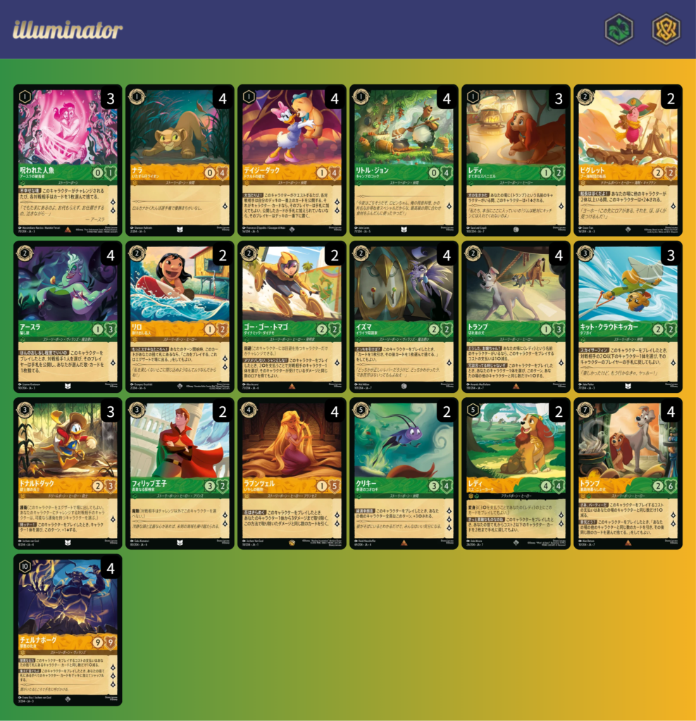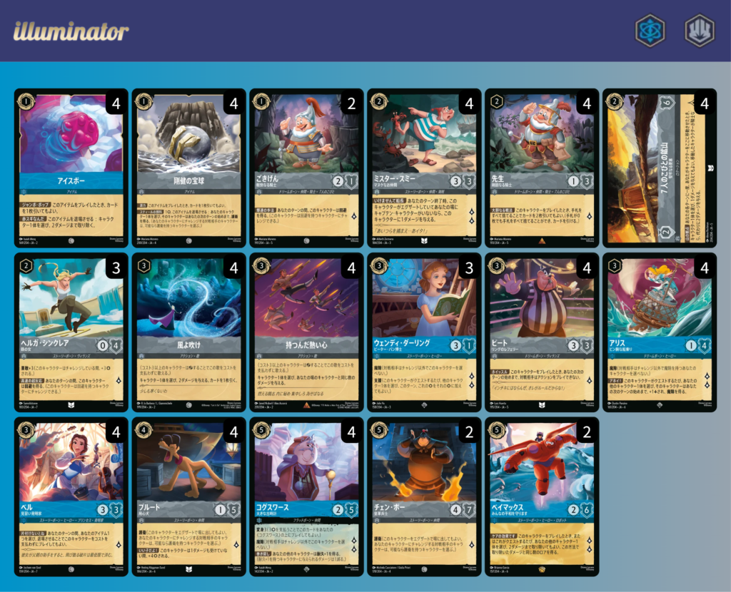 1-2ターン目にほぼ試合が決まります。兎に角、初手のマリガンは序盤の戦いを意識してカードを選ぶこと。3ターン目以降でひっくり返せるのはルビー系とハンデスくらいです。そして盤面に付き合うべきかロアレースぶち抜く方が勝機あるのか、判断を大切に行う事です。構築を見ての通り、攻撃力高めのキャラが盤面に立ちます。意志力3以上のキャラも多く、風が吹いても倒れにくくなっています。ゼウスや熱い心を打つキャラにも注意しましょう。それではあと2週間、お互い練習がんばっていきましょう!