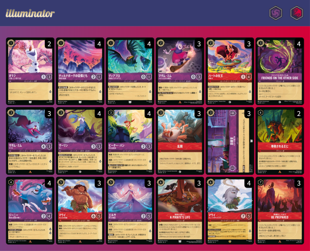 【1オラフ】意志力3の1インクキャラ枠で搭載。1インク枠を10枚とした。本当は4枚搭載したいが勇気の2枚枠へ。